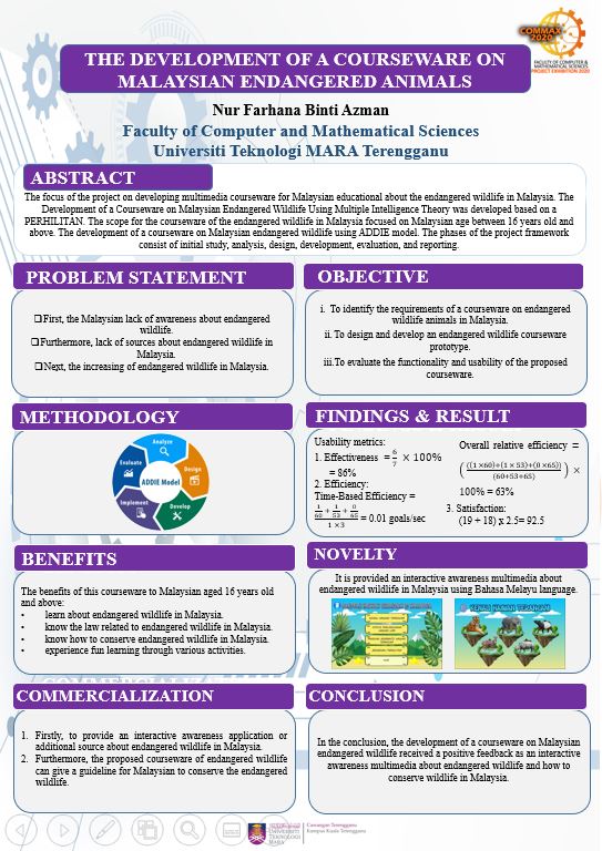 The focus of the project on developing multimedia courseware for Malaysian educational about the endangered wildlife in Malaysia. The development of a courseware on Malaysian endangered wildlife using multiple intelligence theory was developed based on a PERHILITAN. The scope for the courseware of the endangered wildlife in Malaysia focused on Malaysian age between 16 years old and above. The development of a courseware on Malaysian endangered wildlife using ADDIE model. The phases of the project framework consist of initial study, analysis, design, development, evaluation, and reporting. The development of a courseware on Malaysian endangered wildlife using multiple intelligence theory based on visual intelligence, intrapersonal intelligence, logical/mathematical intelligence, and naturalist intelligence. The delivery of content method using CD based. The functionality and usability of the courseware evaluated and tested for the Malaysian age between 16 years old and above.
